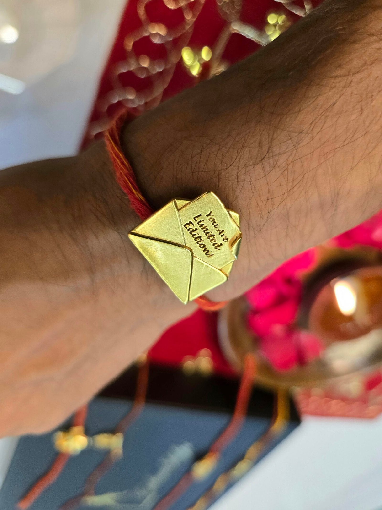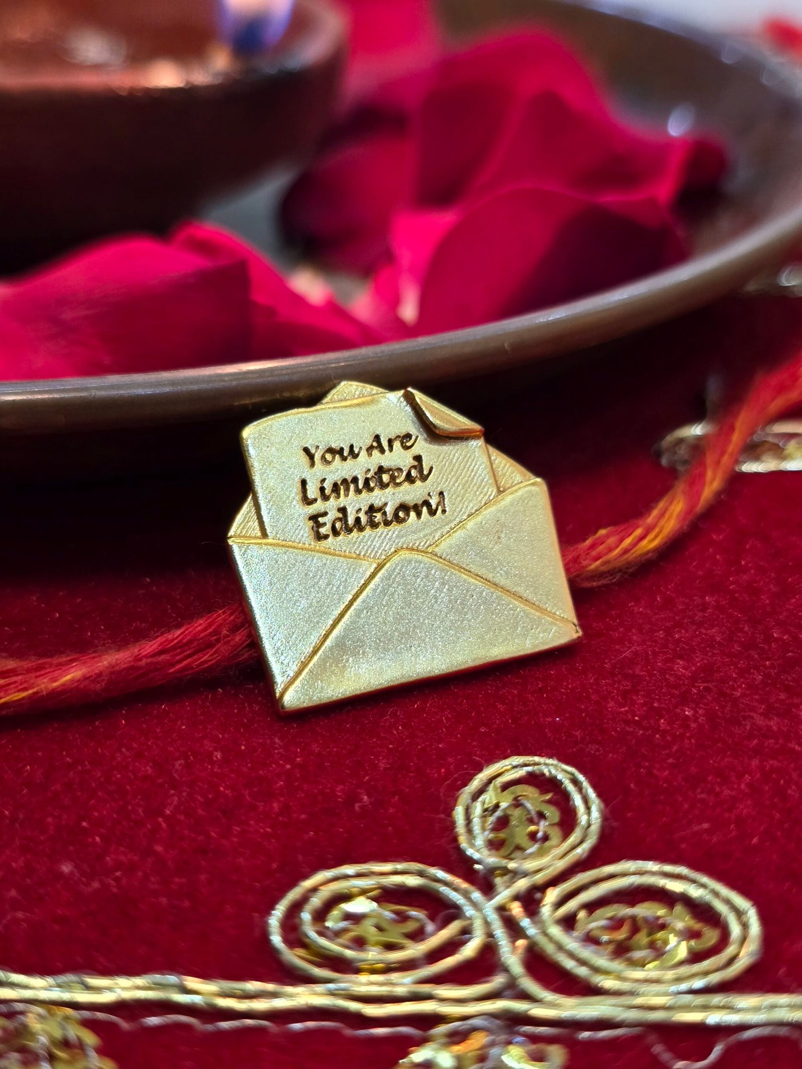 Crafted with clean lines and a contemporary design, this Rakhi features the empowering words “You Are Limited Edition” engraved on a sleek metal plate. It’s not just a Rakhi—it’s a reminder that your bond is rare, special, and made to last.